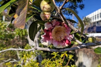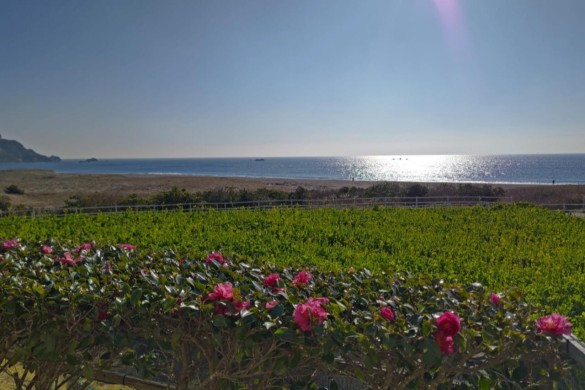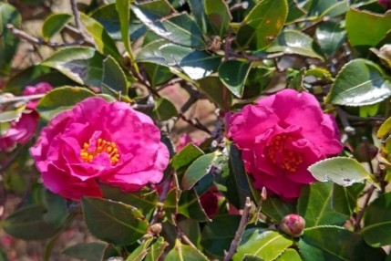 渚の石庭・テラス側の庭など、様々な種類の椿が美しく咲いています。